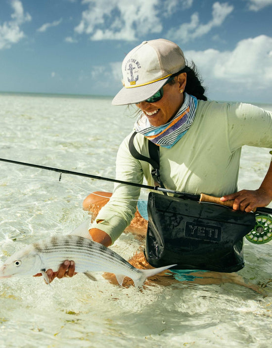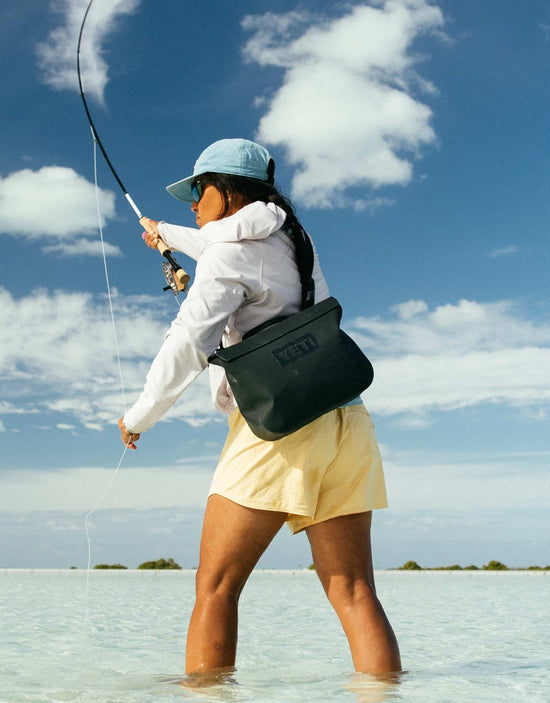 ABOVE: On a fly fishing trip targeting bonefish in the Bahamas, Ambassador Hilary Hutcheson keeps her casting arm unobstructed with her Sidekick Dry® 6L Gear Case worn cross-body. It's important to have your essentials on-hand and not have to worry about anything getting wet when you're wading deep or snapping a photo with your catch.