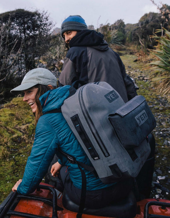 ABOVE: It's a long walk to the beach for surfers in New Zealand's Fiordland. The rainforest and rugged terrain require staying dry... Until it's time to surf. Loaded up on the four-wheeler, Robin makes her way through the prehistoric landscape to the water. Her preferred dry bag carry style: Sidekick Dry® Gear Case on a Panga® Dry Backpack.