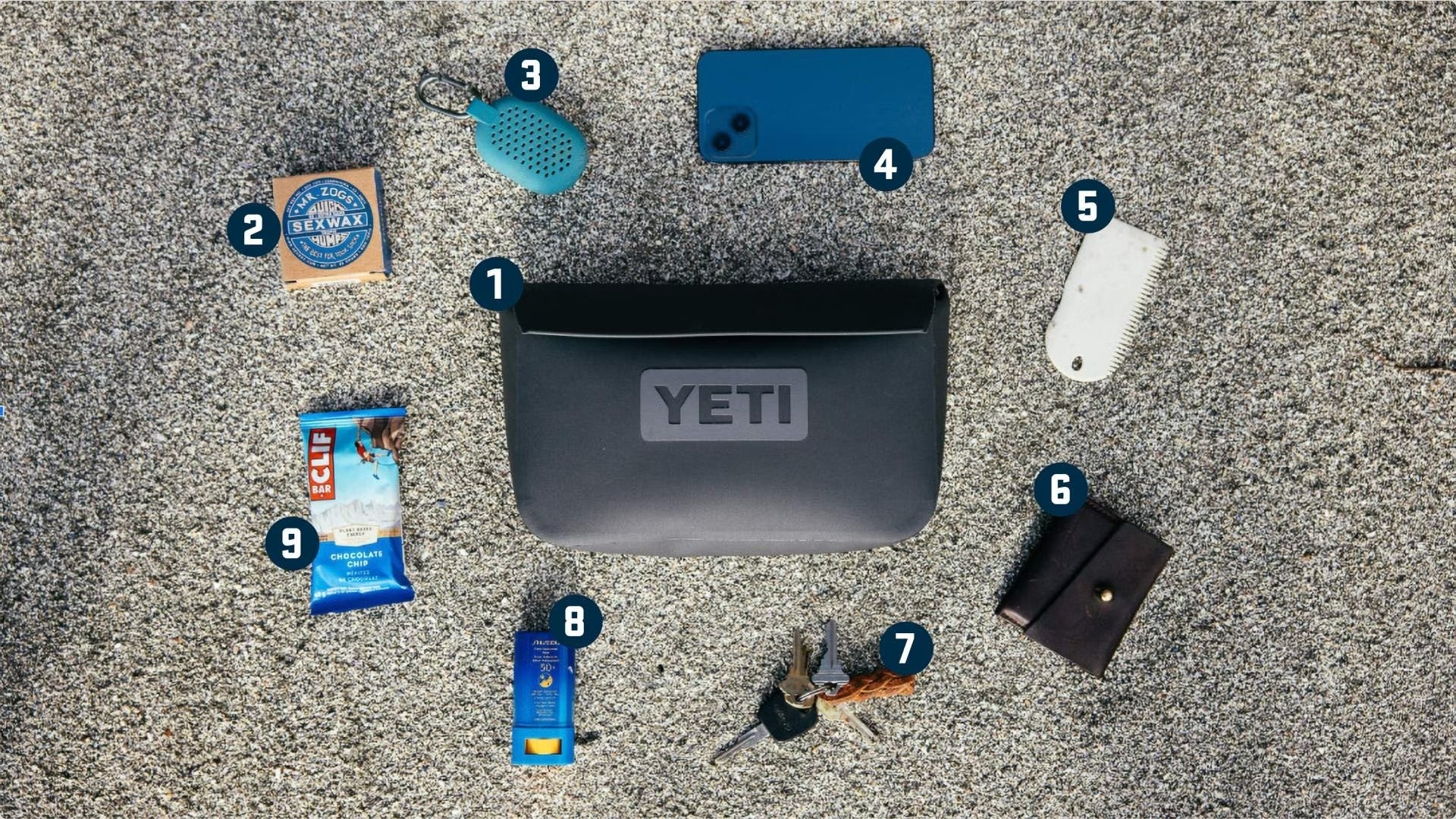 (1) Sidekick Dry® 3L Gear Case (2) Mr. Zog's Sexwax Cold Water Temp Surf Wax (3) Waterproof Speaker (4) Phone (5) Wax scraper (6) Wallet (7) Keys (8) Sunblock (9) Clif Bar