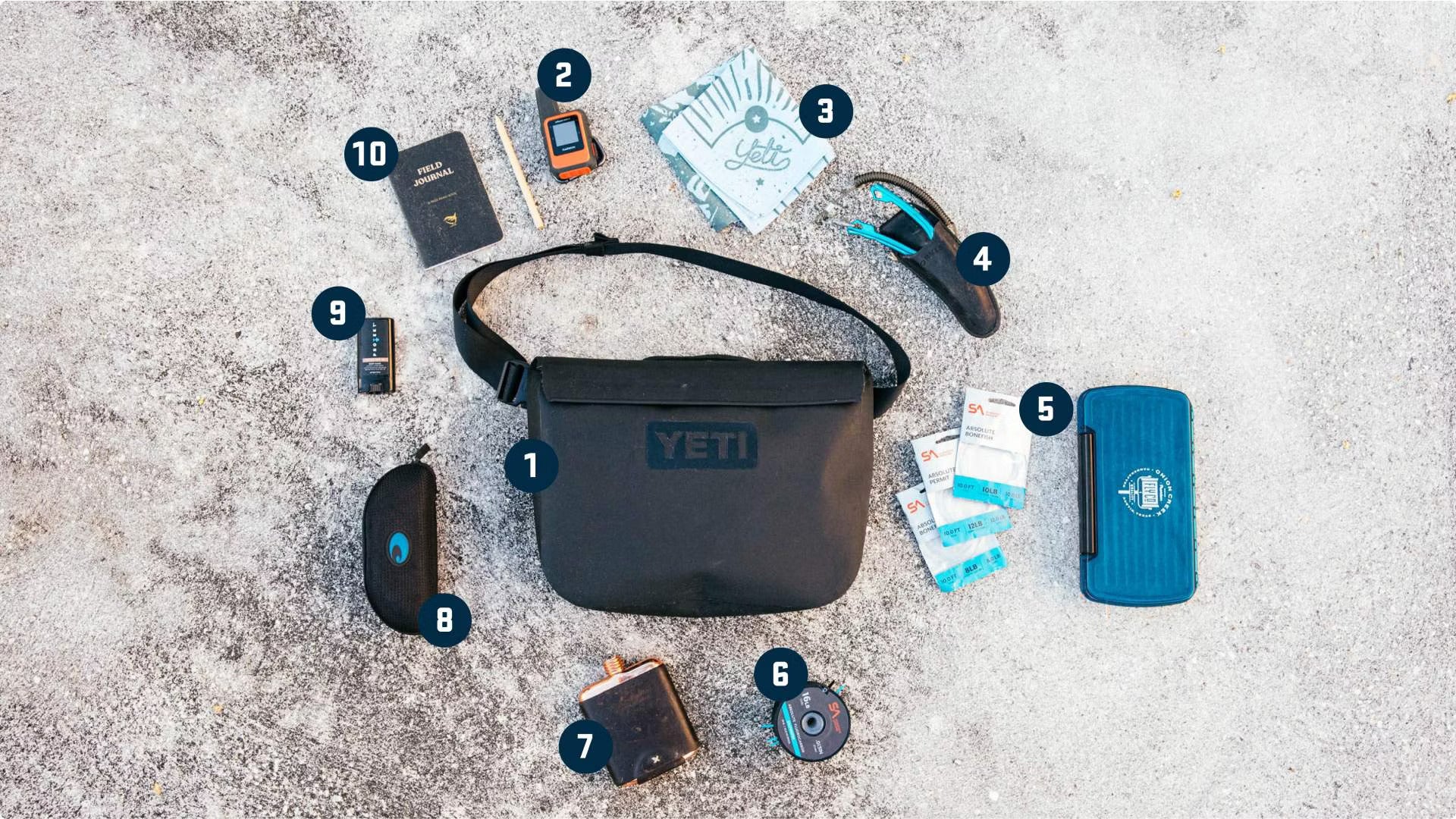 (1) SideKick Dry® 6L Gear Case and Sideclick™ Strap (2) GPS (3) Bandana (4) Loon Pliers (5) Scientific Anglers Leaders & Leader Wallet (6) Scientific Anglers tippet spool (7) Flask (8) Costa Mayfly Sunglasses (9) Protekt Mineral Sunscreen Stick (10) Waterproof notebook and pen.