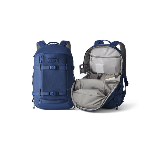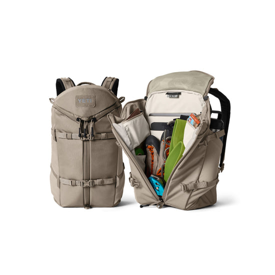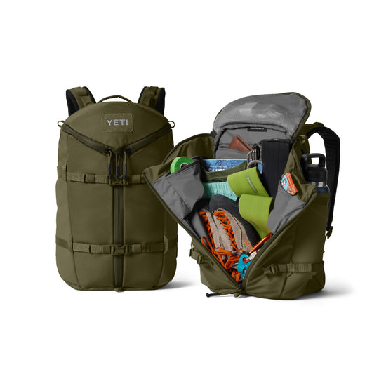 keeping your YETI Water Bottle handy or keeping wet items, like a rain jacket, separated in your bag. Inside, the pocket systems keep smaller items organised, and the reservoir pocket can accommodate a hydration reservoir.